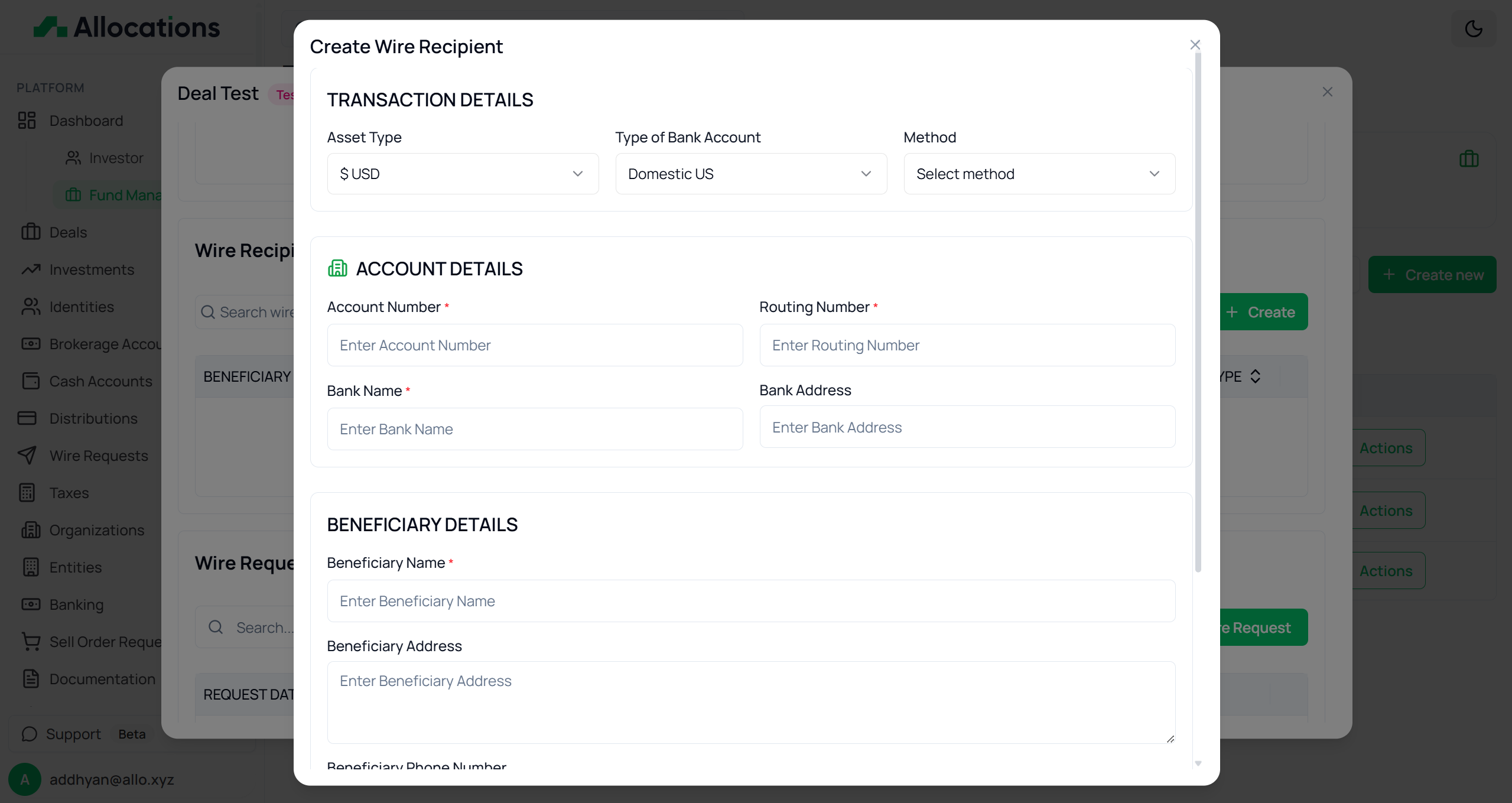 Wire Recipients (Fund Managers can simply add Wire instructions of all the recipients)