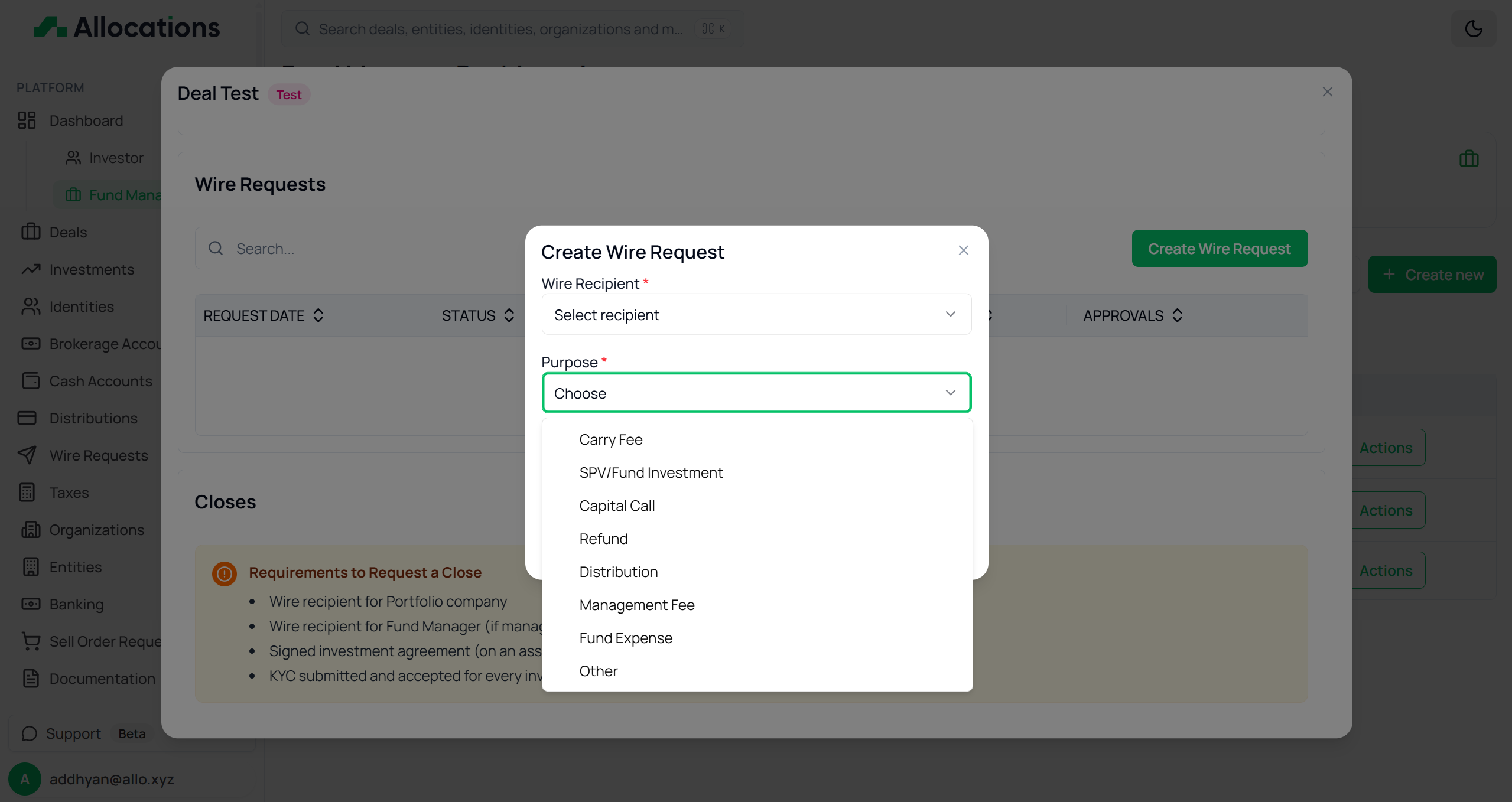 Wire Request (Fund Managers can requests for wire straight from the dashboard)