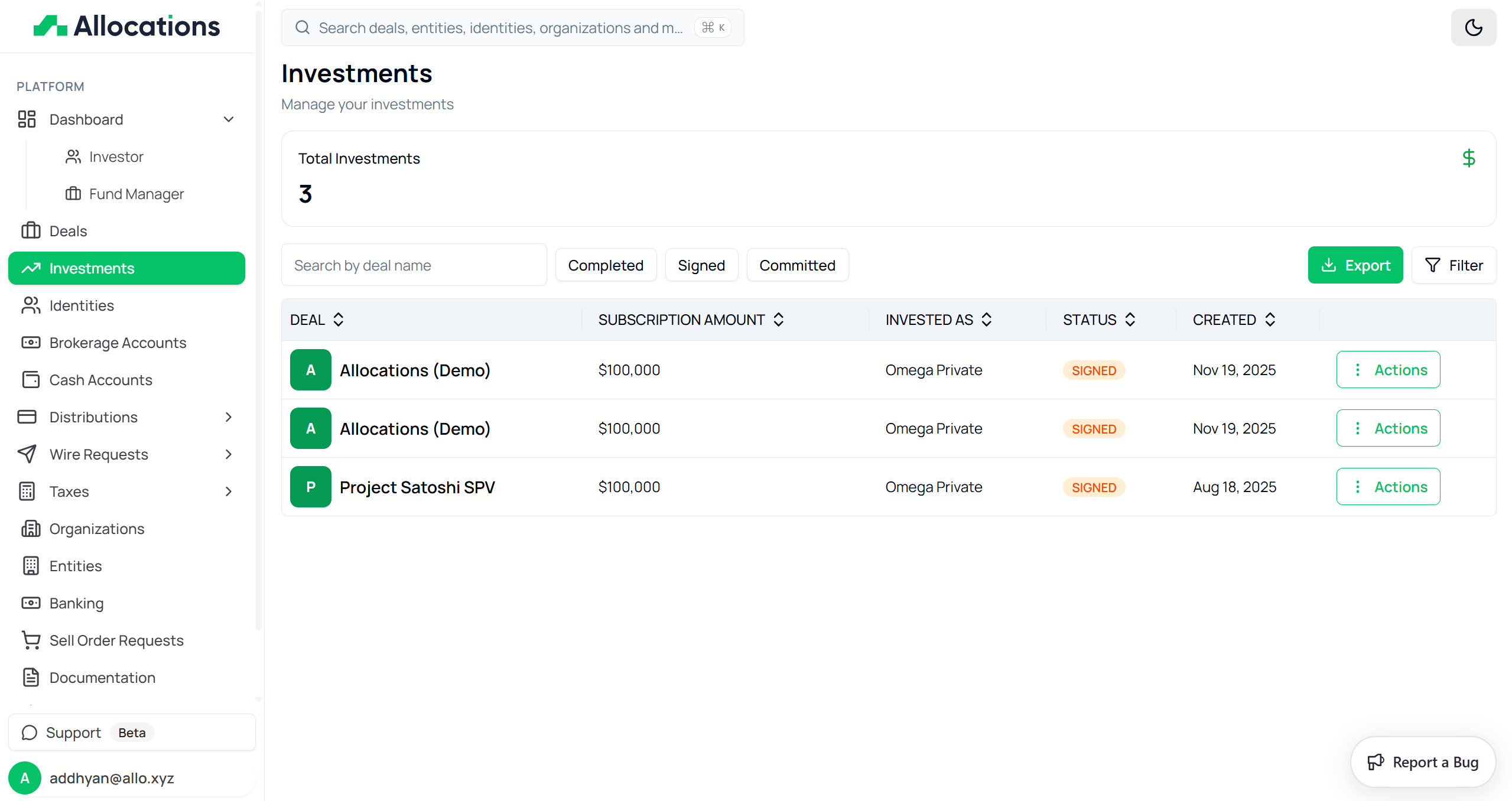 The **Manage Investment** page allows investors to view and track the full lifecycle of a specific investment.