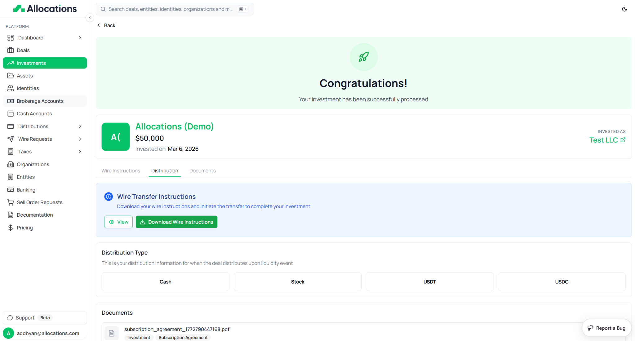 The platform provides **Wire Transfer Instructions**, which include the necessary banking information required to send funds for the investment. Investors can either view the instructions directly or download them for reference.