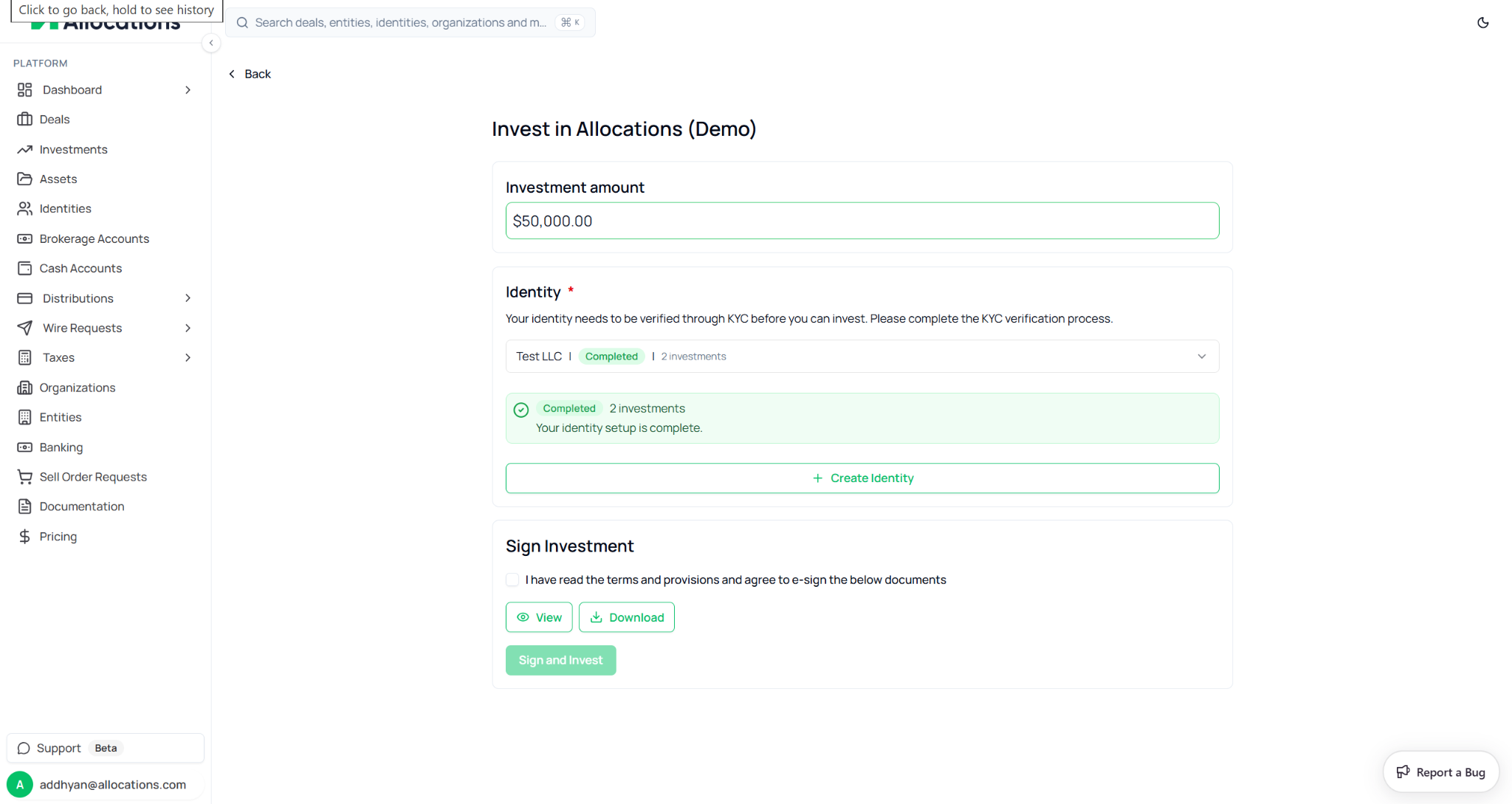 Every investment on Allocations must be associated with an **identity**, which represents the legal entity making the investment.