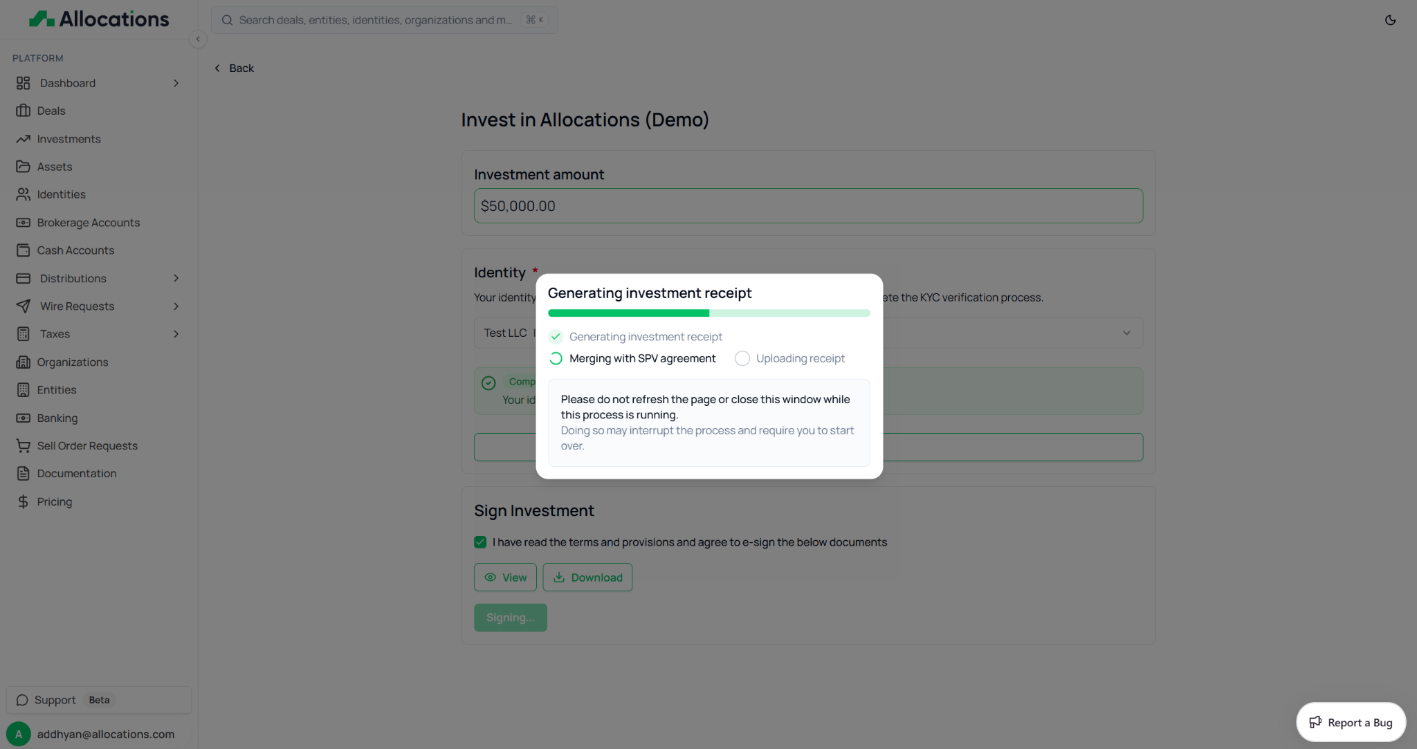 A progress window may appear while these steps are completed. Investors should avoid refreshing the page or closing the window during this process to prevent interruptions.